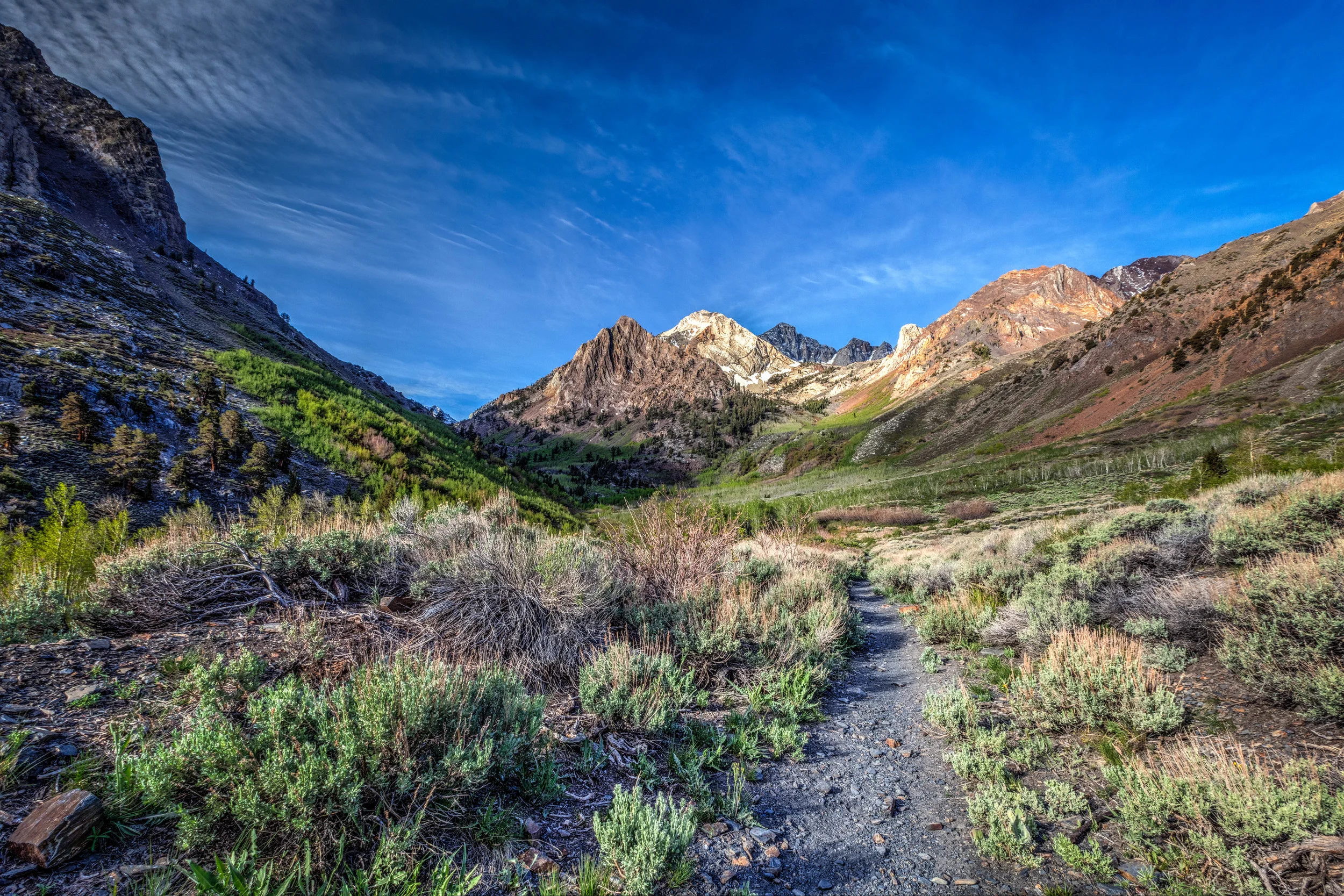 I was not sure how far I was going to go but it kept getting prettier as I went. The trail slowly winds to the left (southwest) up the canyon and behind a ridge. Decided at a minimum wanted to get to the point where the ridge was. As I proceeded up the valley there was plenty of songbirds providing a wonderful musical. I reached the spot I had targeted as a goa. The trail and the morning were so nice I said to myself maybe just a little bit further. I did the “little bit further” a few more times and as the trail continued to curve to the southwest way up on the horizon I sawas treated to the image of the snow covered Mt. Crocker (12,458-ft.) rising at the head of the valley.