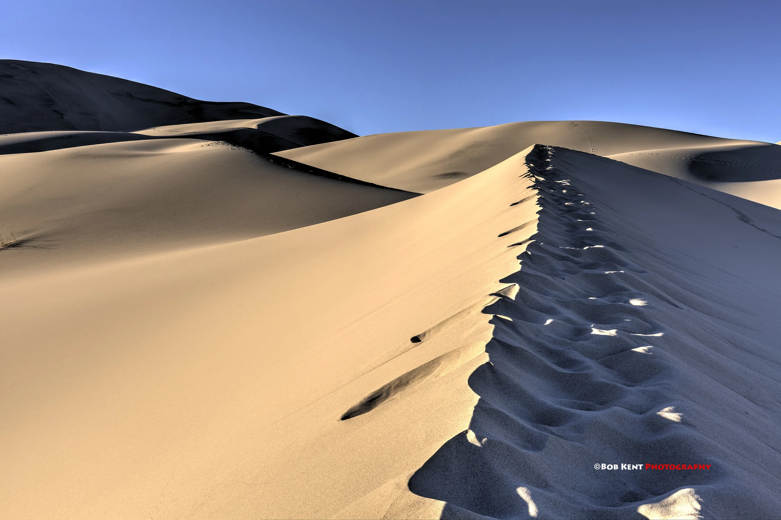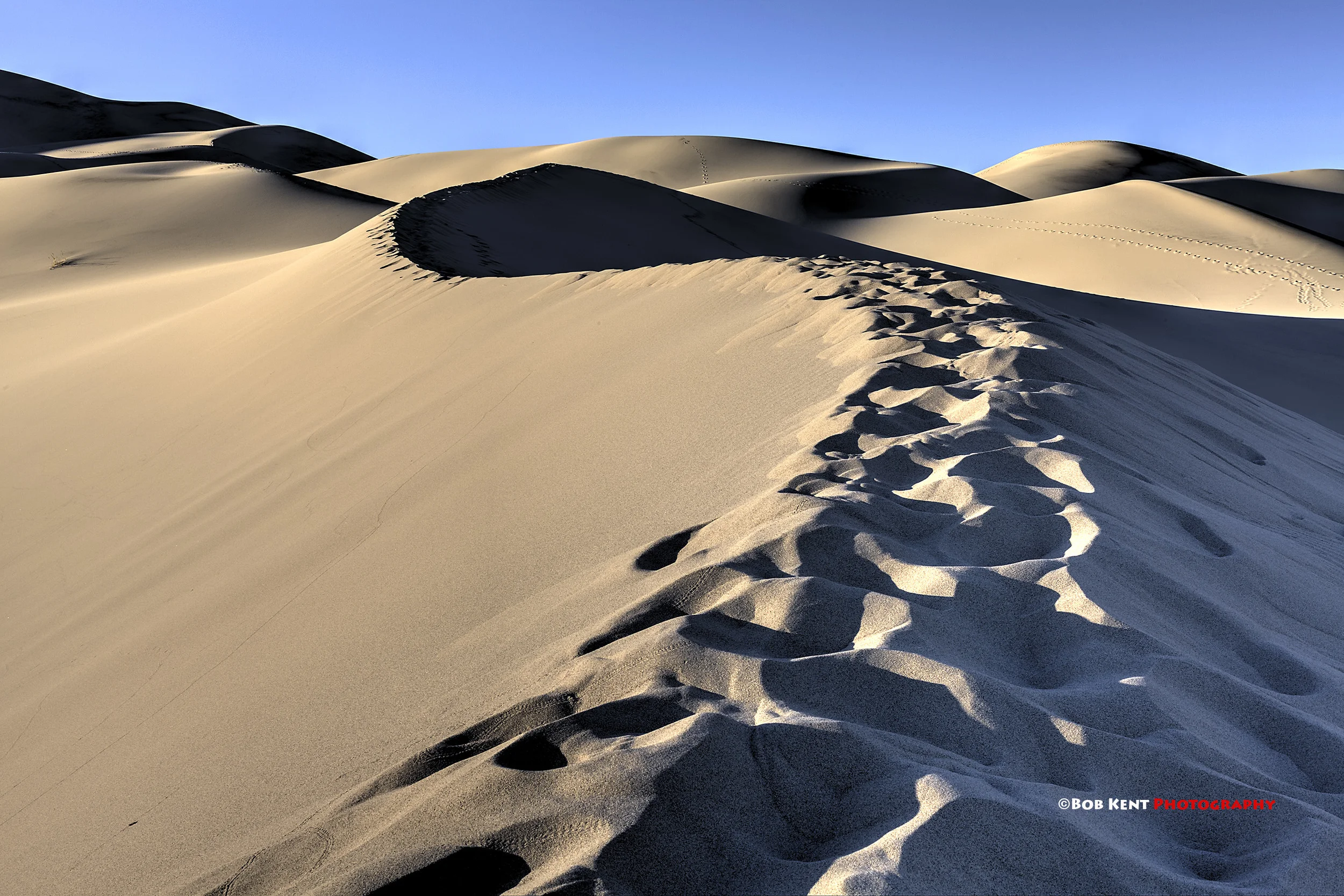 I thought I was the only one on the dunes. Then I spotted a spec that was a hiker at the top of the dunes. My guess he had to have started at least an hour before me. Man the view he must have had! It was only later, processing images, that I found another photographer had been on the dunes. In the image below if you look just above the curved ridge there is another photographer with a tripod. He is just a speck but he is there. Above him on the ridge just to the right was the hiker on his way to the top. The fact that they are just specs give you a sense of just how big these dunes are. They are actually the highest in North America!