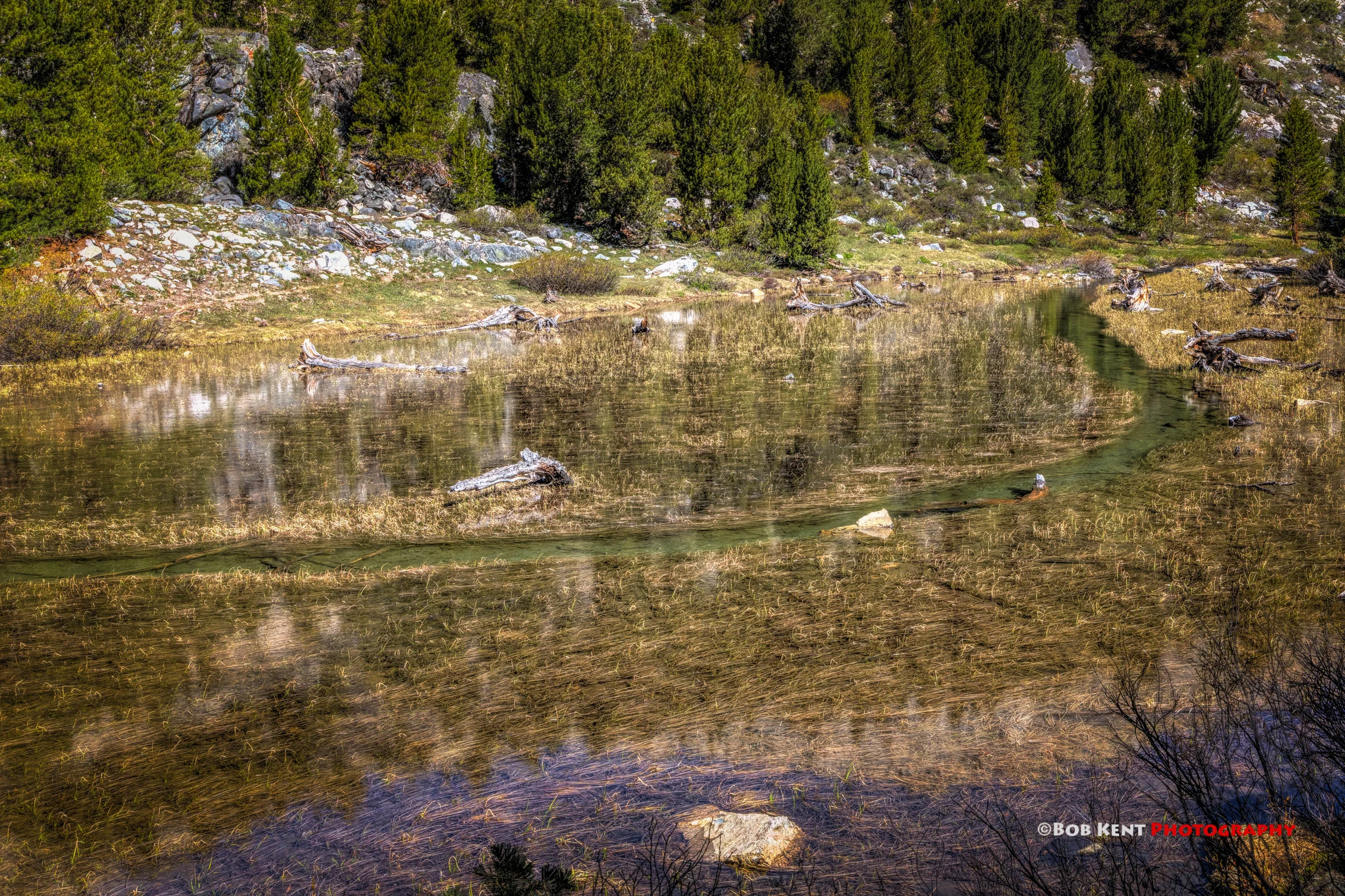 On the far side of the lake there is another use trail that goes off to the left that takes you to the lakes inlet. At this time of the year it was flowing well. There was a small mound in the trail and if you go up and over that you are treated to a wonderful cascade in Rock Creek rushing down from Box Lake.